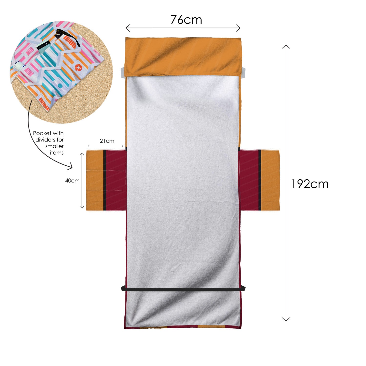 Our sun lounger towel is generously sized to fit most standard sun loungers perfectly. With dimensions of 192cm x 76cm, plus an additional 25cm in length that folds over the top of your lounger to keep it in place.