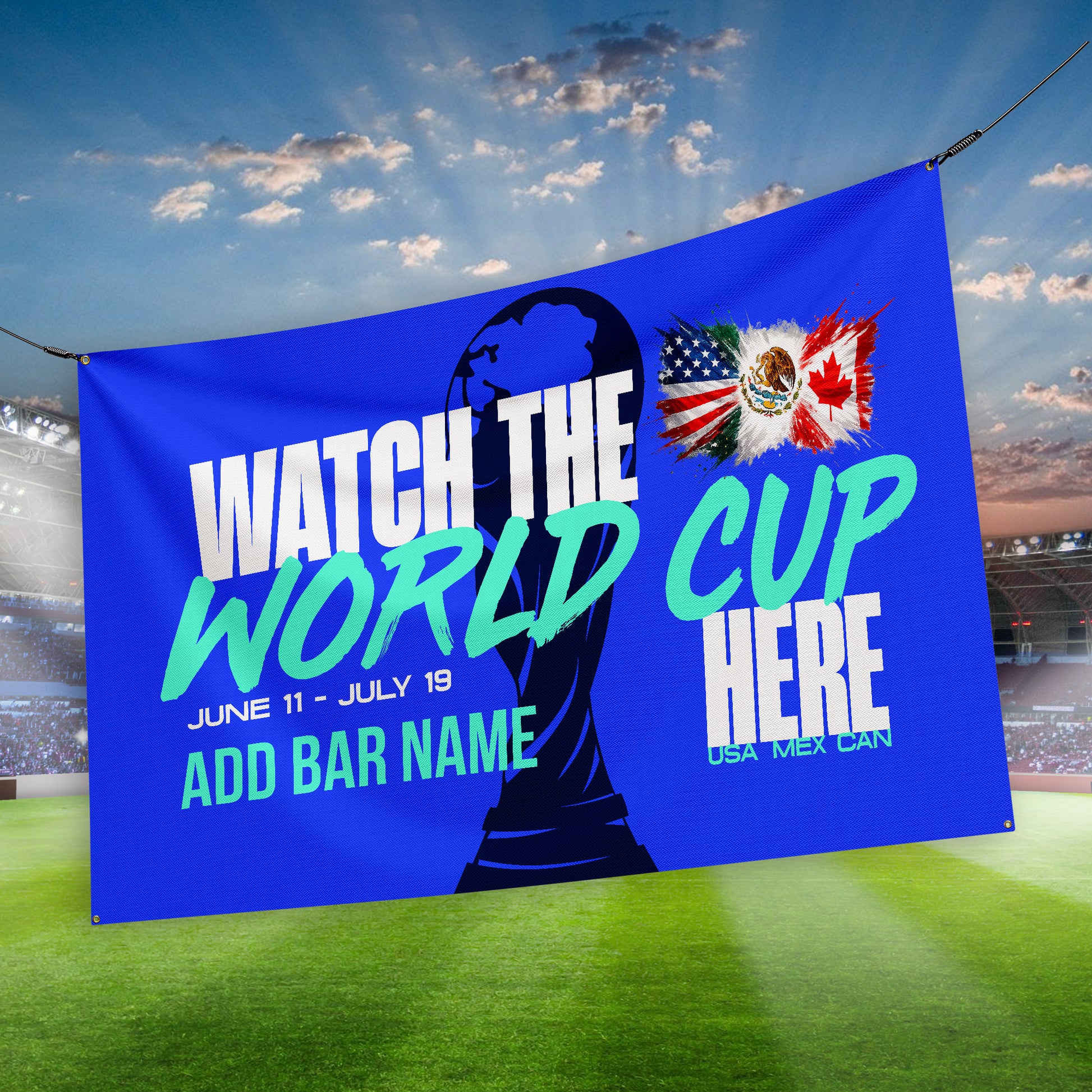 The perfect World Cup party decoration for your upcoming celebration for the ultimate football fan. Customise with a bar name/message!